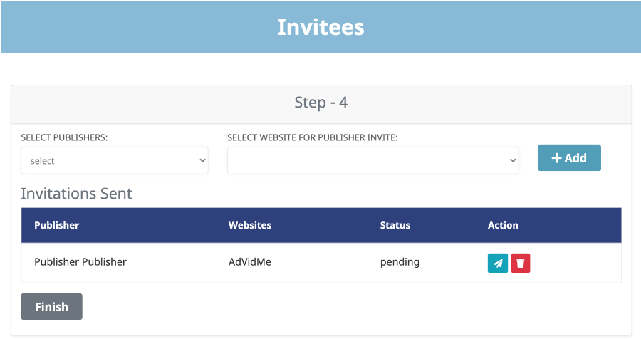 You have access to 2 actions under in Invitations Sent sub panel in Invitees. (aeroplane and trash can) You can send an invitation to the publisher. Pressing this will change status from draft to pending while awaiting the publisher’s decision to accept.